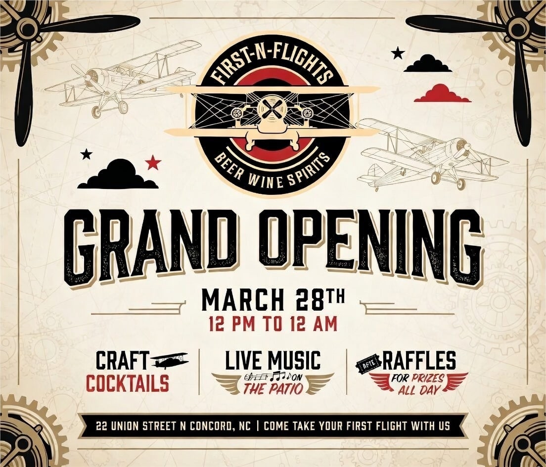 Welcome aboard for FIRST-N-FLIGHTS Grand Opening! Join us for first class craft cocktails, fine wine, bourbons, live music, raffles, a variety of seating options and more!