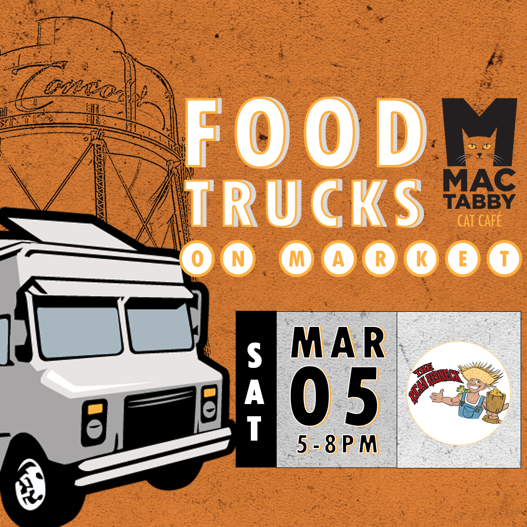 Concord’s own The Rican Redneck makes return visit at Mac Tabby on Saturday, 3/5! Hang out on our front porch, enjoy great food and beers, as well as coffee and other drinks from our cafe! Want to see the cats? We suggest reserving your spot in the cat lounge in advance at MacTabby.com. “Half Cats | Half Coffee | One Amazing Experience!”