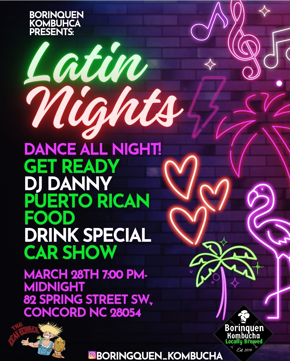 #LatinNight #ConcordNC #PuertoRicanFood #SupportLocal #DanceNight #ConcordEvents #BorinquenKombucha #LatinVibes #CarShow #NCEvents