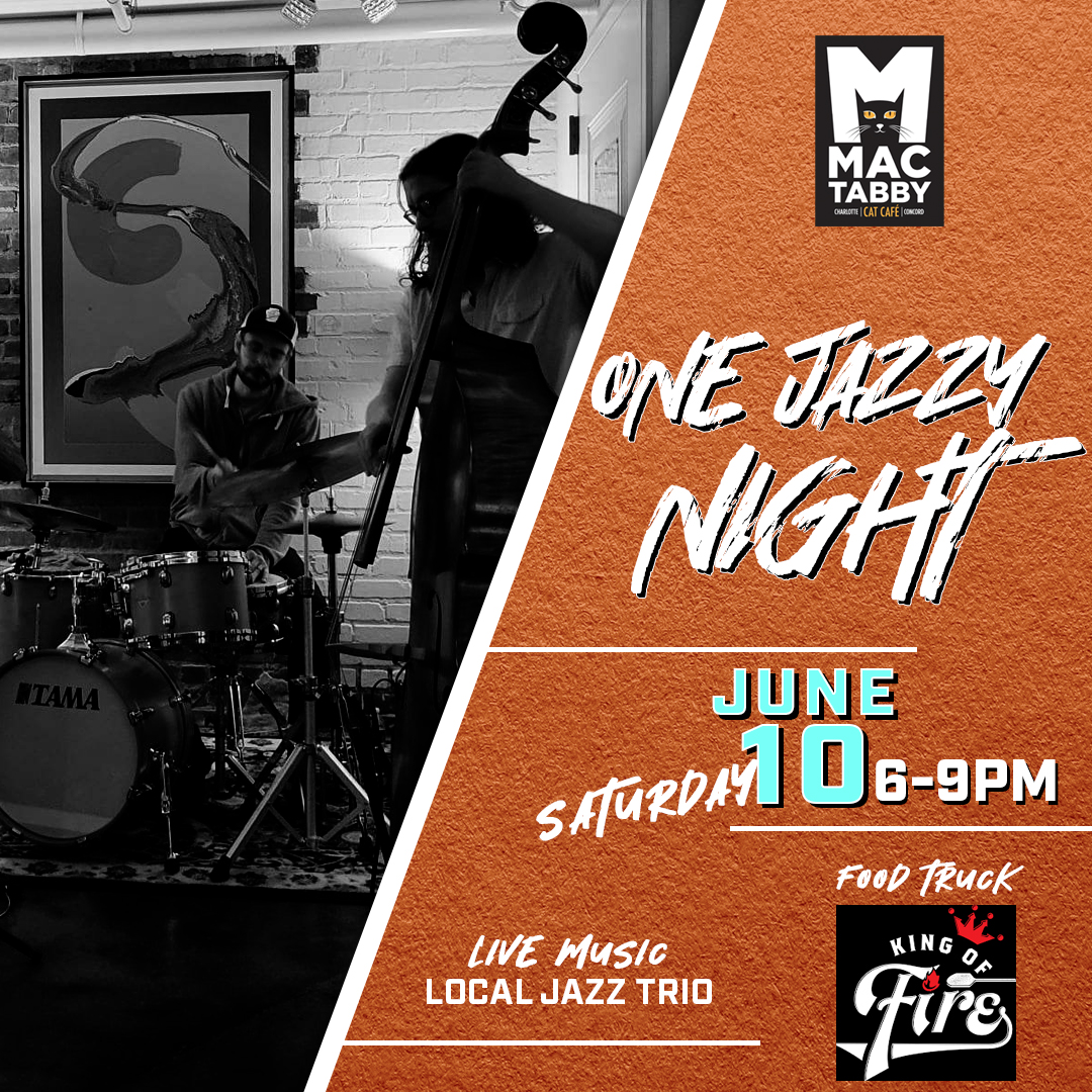 Jazz Night at Mac Tabby Cat Cafe with favorite King of Fire Pizza in Downtown Concord on Saturday, 6/10! Hang with the cool cats for great food, live jazz, cold beverages, and coffee from our cafe! Want to see the cats? We suggest reserving your spot in the cat lounge in advance at MacTabby.com. “Half Cats | Half Coffee | One Amazing Experience!”