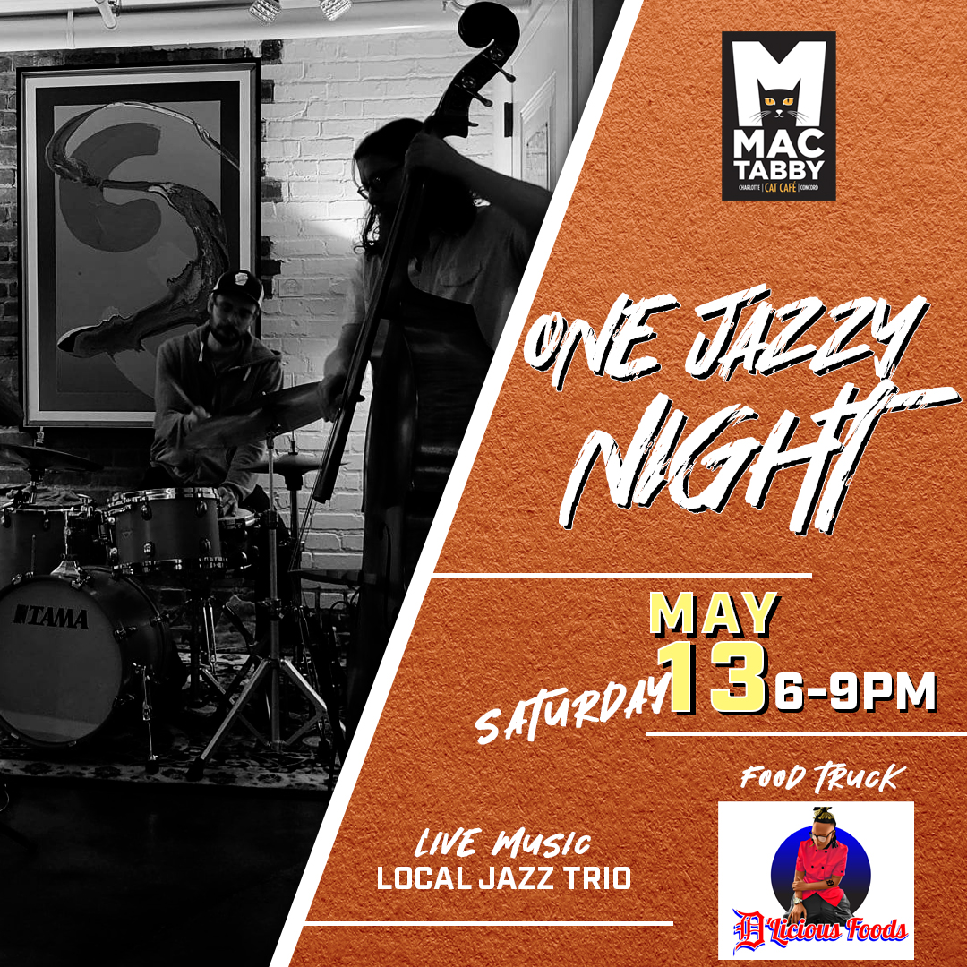Jazz Night at Mac Tabby Cat Cafe with favorite D’Licious Foods (and their famous pot roast) in Downtown Concord on Saturday, 5/13! Hang with the cool cats for dinner, live jazz, cold beverages, and coffee from our cafe! Want to see the cats? We suggest reserving your spot in the cat lounge in advance at MacTabby.com. “Half Cats | Half Coffee | One Amazing Experience!”