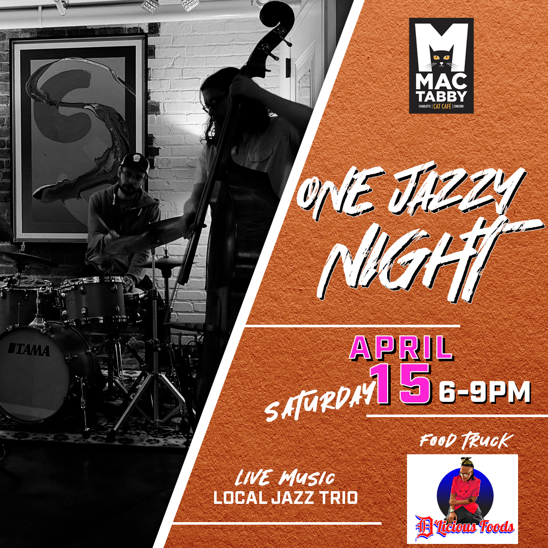 Jazz Night at Mac Tabby Cat Cafe with favorite D’Licious Foods (and their famous pot roast) in Downtown Concord on Saturday, 4/15! Hang with the cool cats for dinner, live jazz, cold beverages, and coffee from our cafe! Want to see the cats? We suggest reserving your spot in the cat lounge in advance at MacTabby.com. “Half Cats | Half Coffee | One Amazing Experience!”