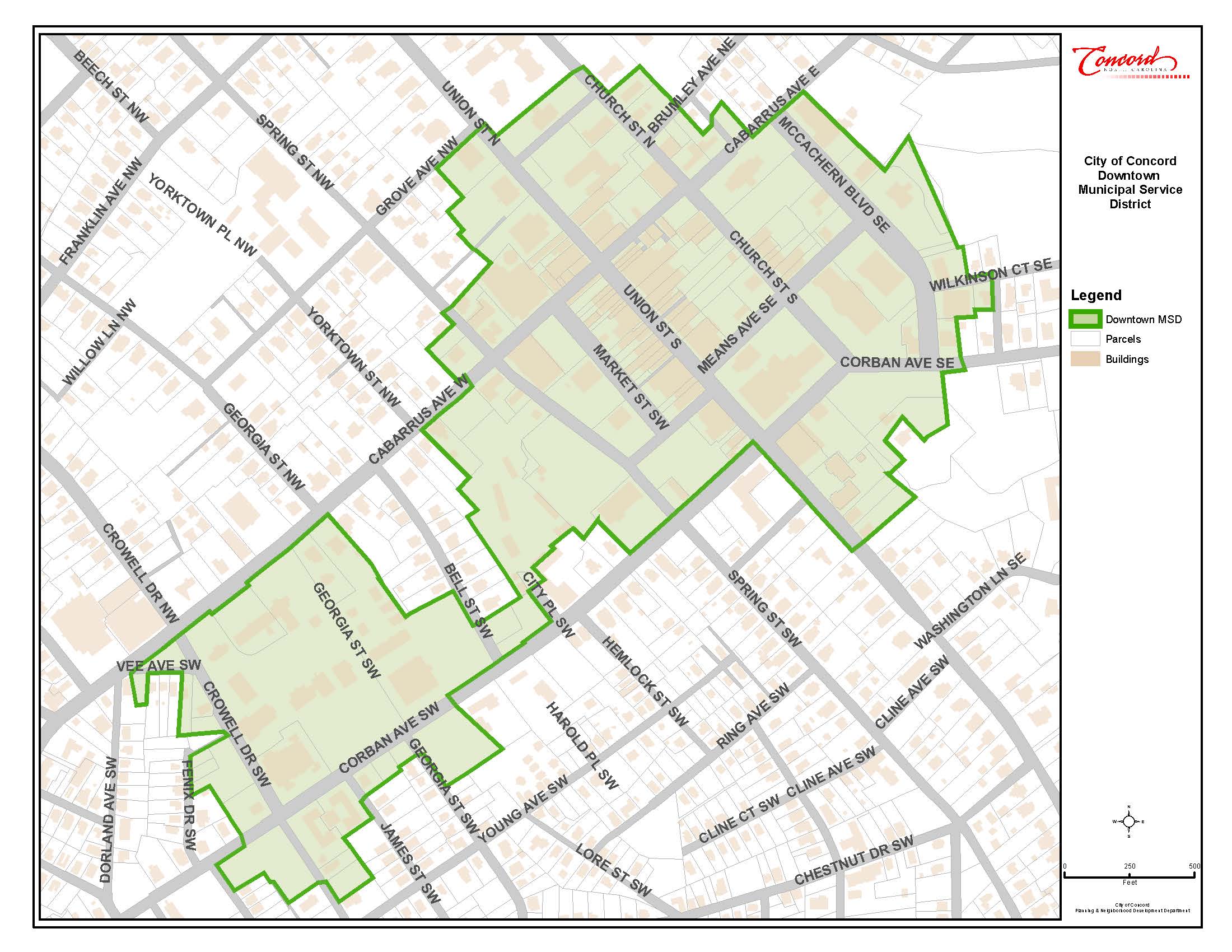 Answer: The City of Concord has a downtown Municipal Service District (MSD) that serves as a technical definition for Downtown Concord. Property owners within the MSD pay additional property taxes to the City to support MSD services. See the boundaries here.